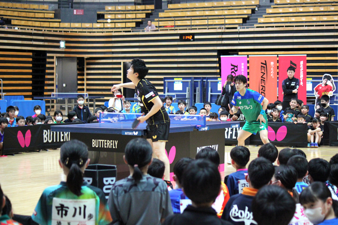 トッププロの選手が実際にどのような練習をしているかを実演し、そこに倉嶋総監督の監督経験に基づく解説がはいりました。その後行われたデモンストレーション試合では、引退してから練習はゼロ、とおっしゃる水谷さんと現役選手の及川選手・吉田選手の迫力あるラリーに、大きな声と拍手で両選手の応援が行われる、非常に熱気に満ちたイベントとなりました。